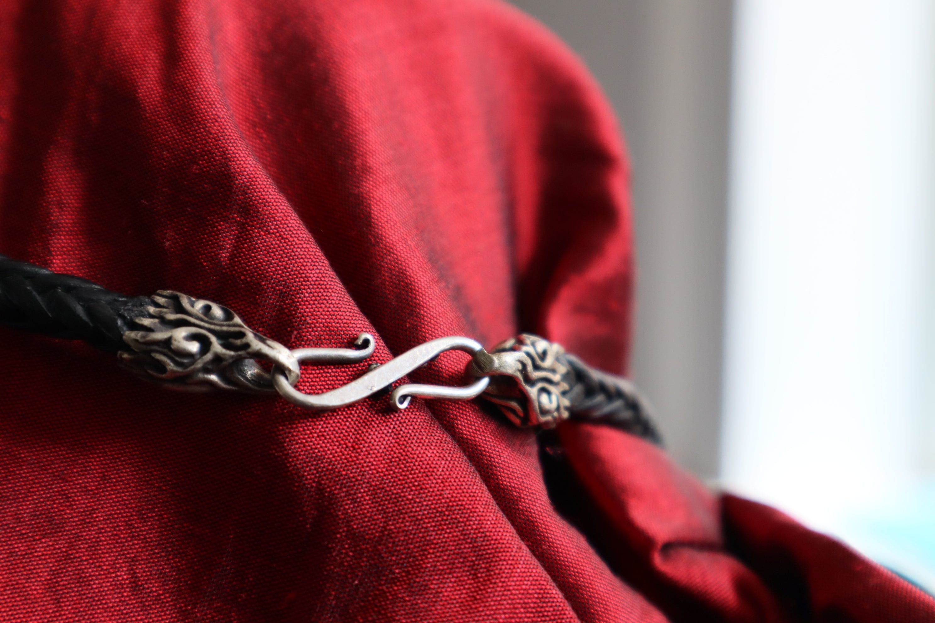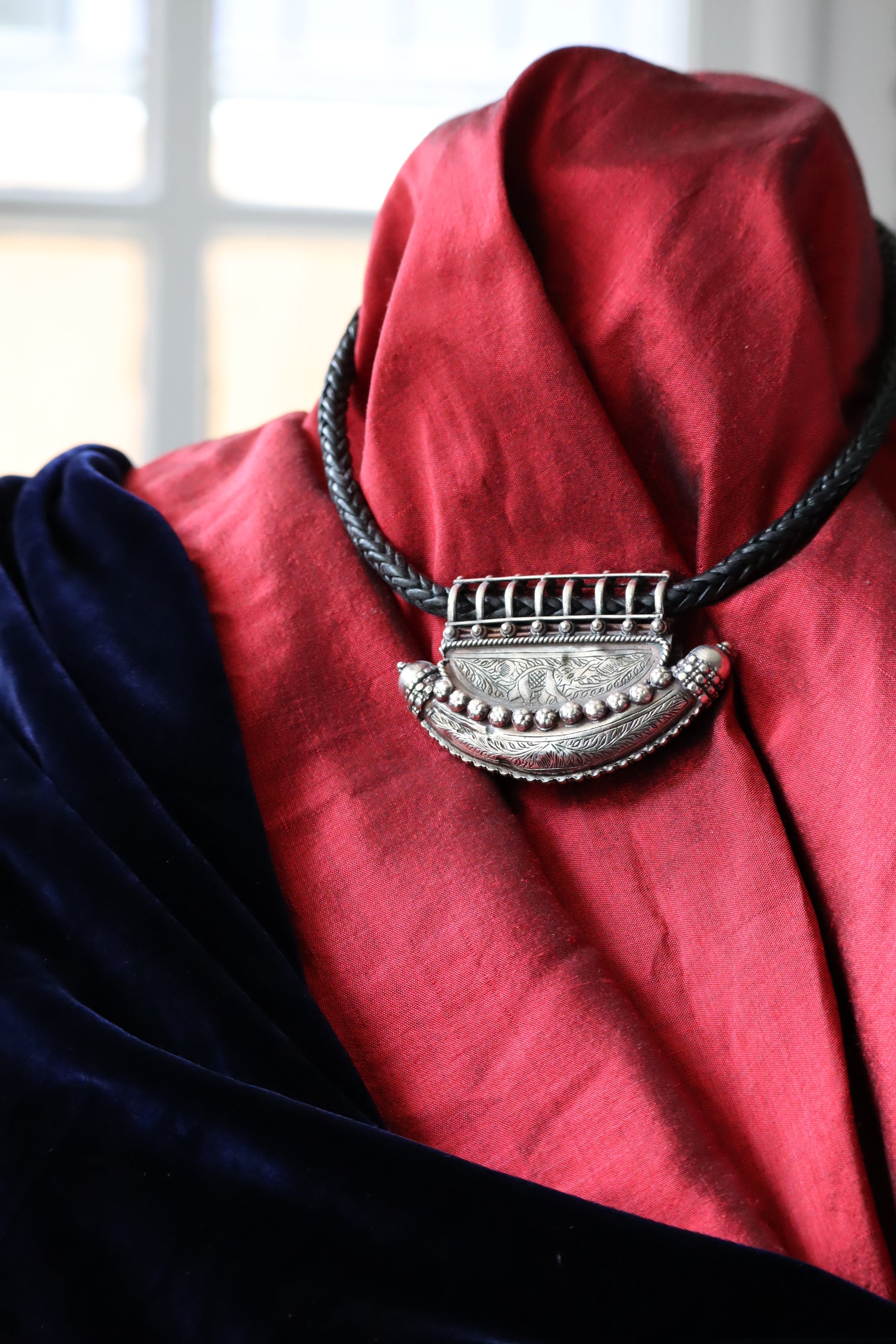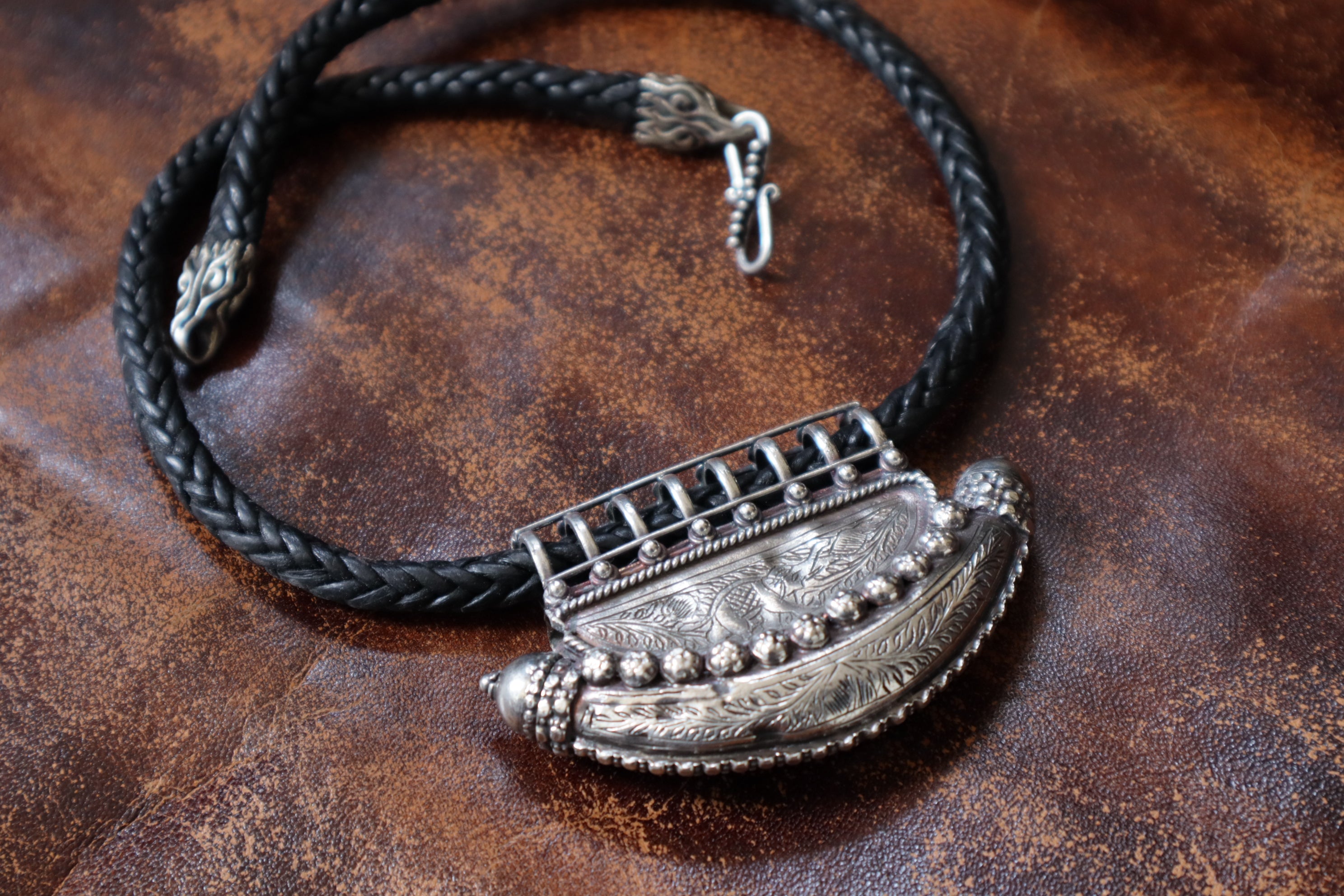 Sterling silver hand-etched talisman with elephant and floral details. Symbolizes good fortune and compassion. The pendant is attached to a braided leather rope with a sterling silver clasp.
